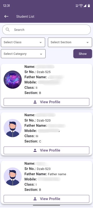 Get an organized list of all students enrolled in your institution. Use filters to sort students by class, section, or stream for fast access. This is especially helpful during roll calls, report generation, or performance tracking, providing a smart, responsive interface for educators and staff.