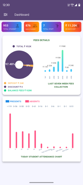 Record and monitor student attendance with ease. Mark present, absent, late, or on leave with just a tap. The system syncs in real time with the backend and parent app, allowing instant notifications. Detailed monthly reports and trend graphs help administrators identify attendance issues early.