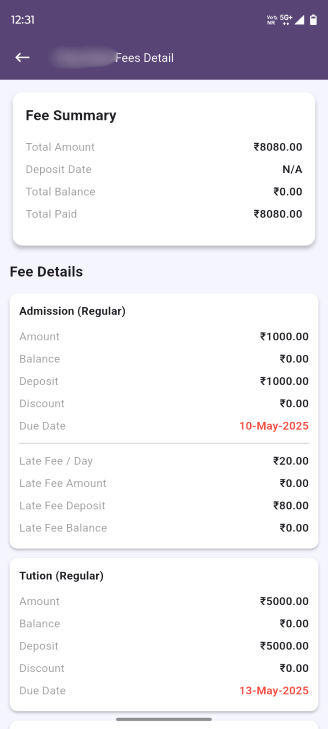 Easily access the fee records of any student. See the full history of payments, dues, discounts applied, fine penalties, and downloadable receipts. This section provides a transparent view of each student’s financial standing, helping both schools and parents keep track of fees in real-time.