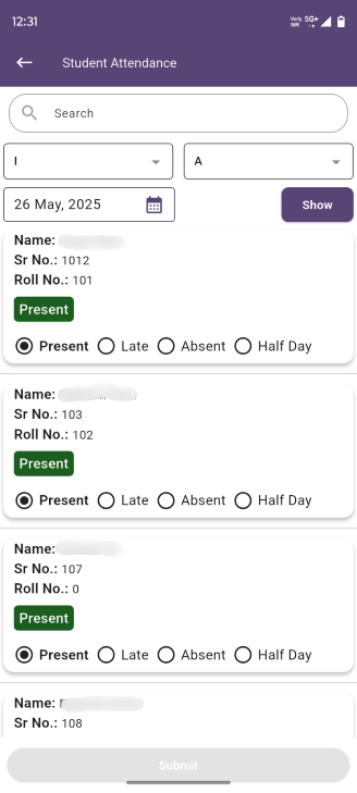 Get an organized list of all students enrolled in your institution. Use filters to sort students by class, section, or stream for fast access. This is especially helpful during roll calls, report generation, or performance tracking, providing a smart, responsive interface for educators and staff.