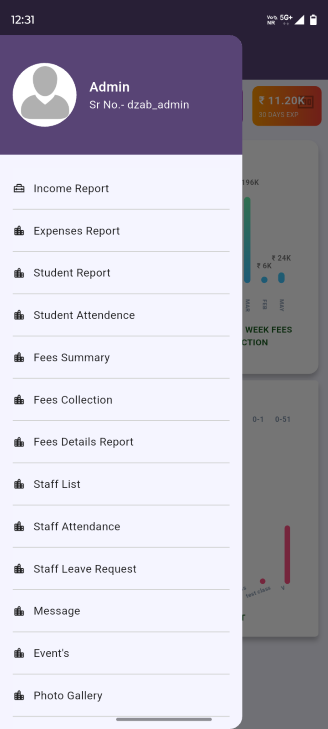 The sidebar acts as your central control panel, offering quick access to all core modules like students, staff, fees, attendance, reports, and settings. Designed for efficiency, it keeps your navigation smooth and allows you to switch between features with minimal effort — perfect for mobile users managing school operations on the go.